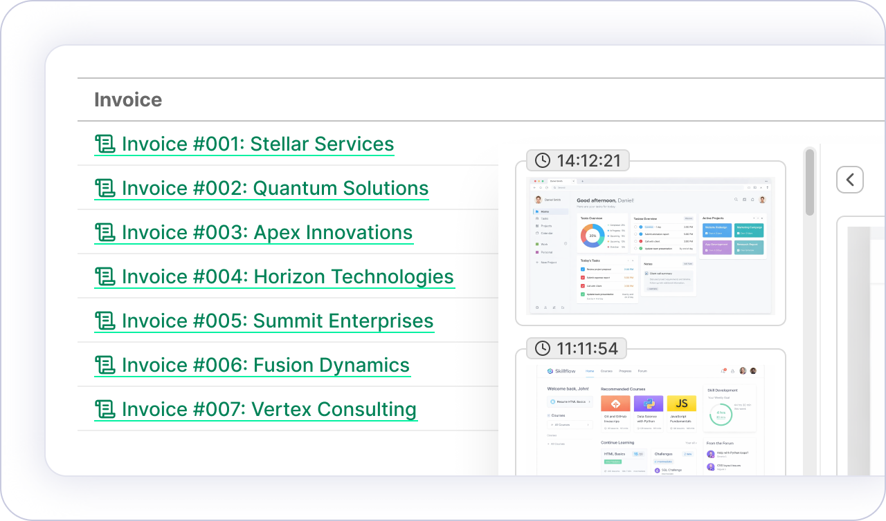Screenshots give you concrete evidence of work done. When a client questions an invoice, you can show exactly what was on screen, which files were open, and when.