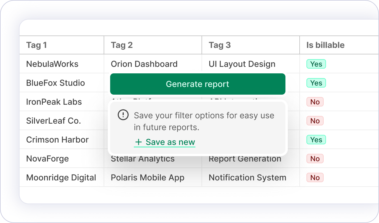 Create the kind of work report your client expects. Customize columns, rounding, grouping, and get insights into the applications, websites, or activities used during the reported time.