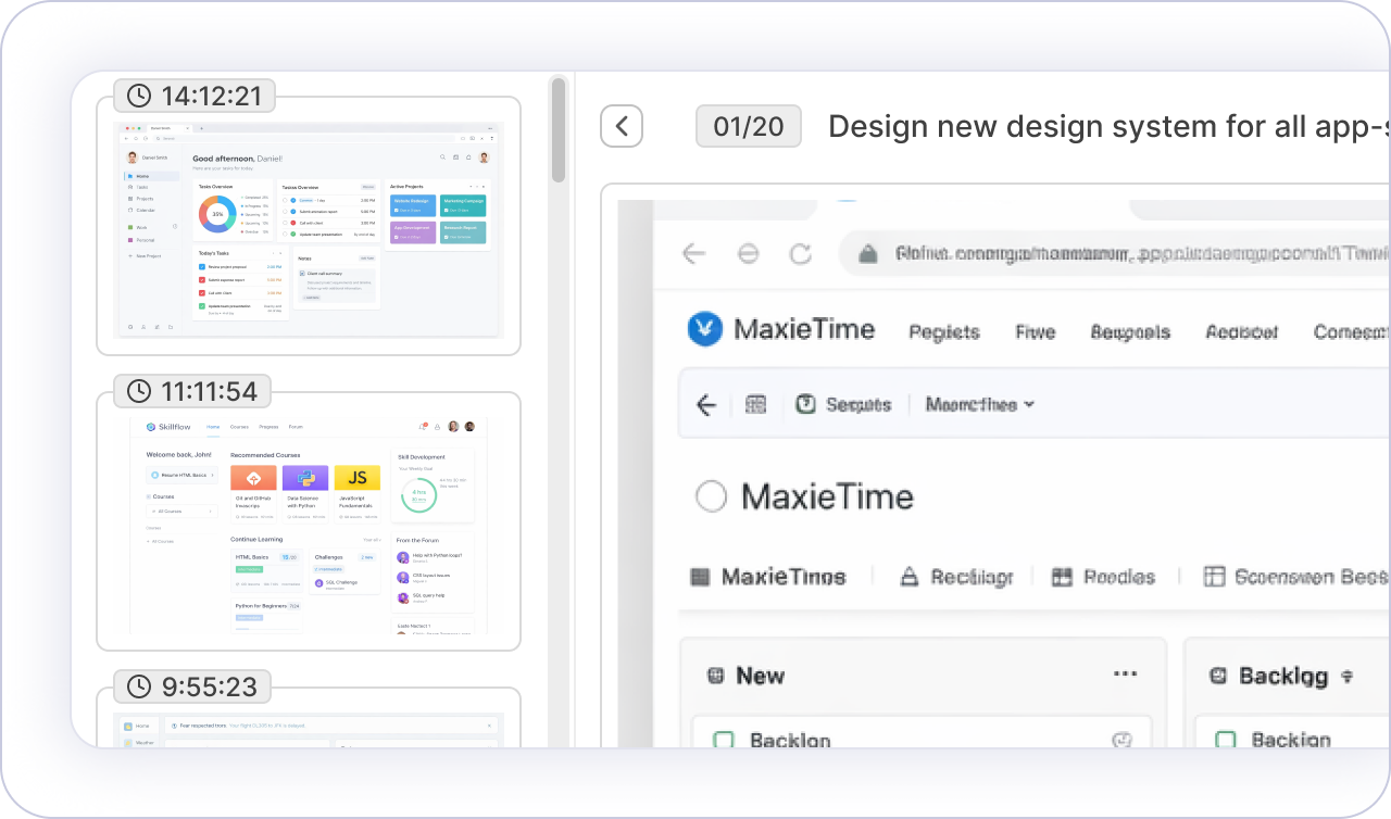 This works especially well for tasks that are hard to describe in a timesheet entry. Instead of writing "worked on design", you have visual proof of exactly which screens, files, and tools were in use.